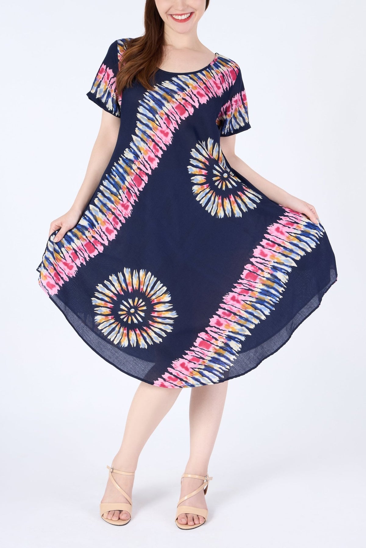 Stay cool and stylish in our breathable, lightweight women's dress with pockets. Crafted from comfortable and light rayon, this dress features an easy pull-on closure, two side pockets, and short sleeves. Available in three sizes, it provides a comfortable and stylish fit for most US women. Perfect for lounging at home, beach outings, festivals, and hot summer days, this versatile knee-length dress suits any occasion. For best care, hand wash in cold water and hang to dry. If using a washing machine, place the dress in a mesh laundry bag and wash on the 'Delicates' cycle.