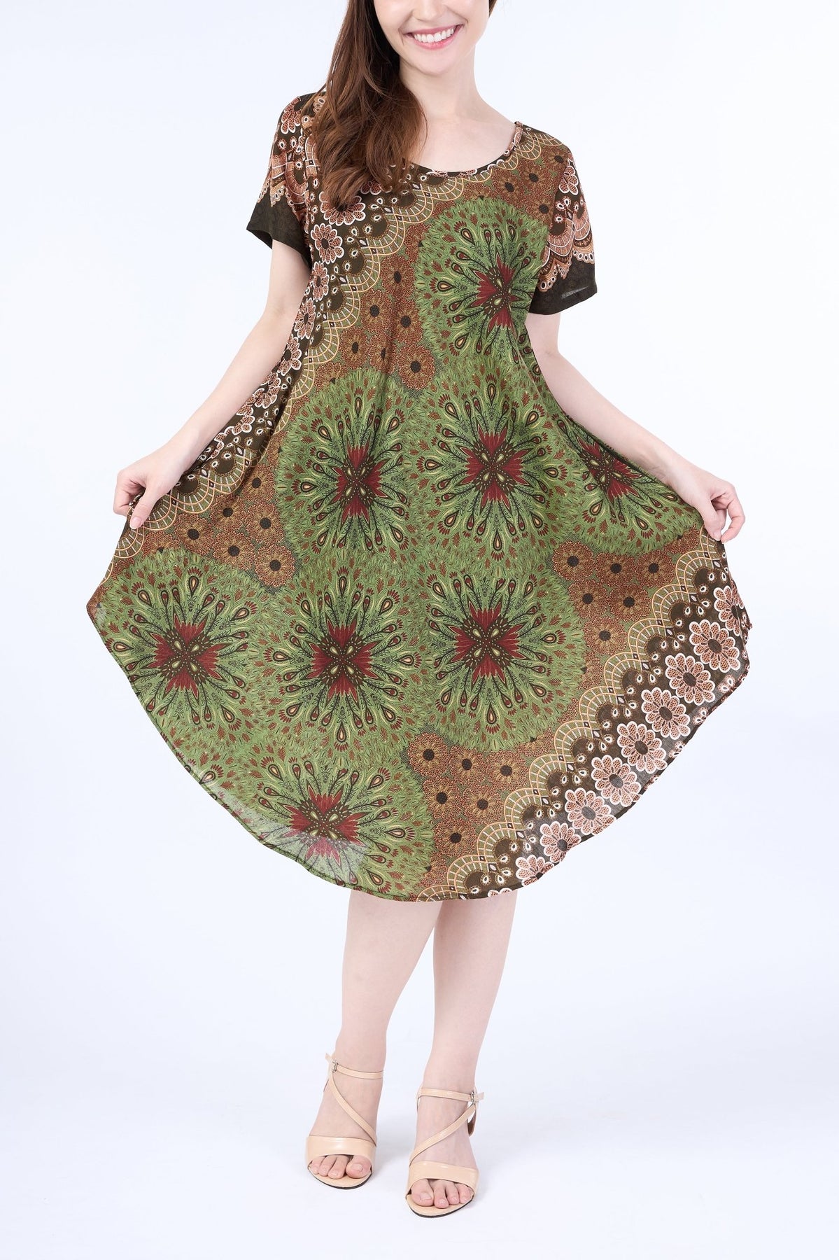 Green Flower Mandala Dress with Sleeves and Two Pockets